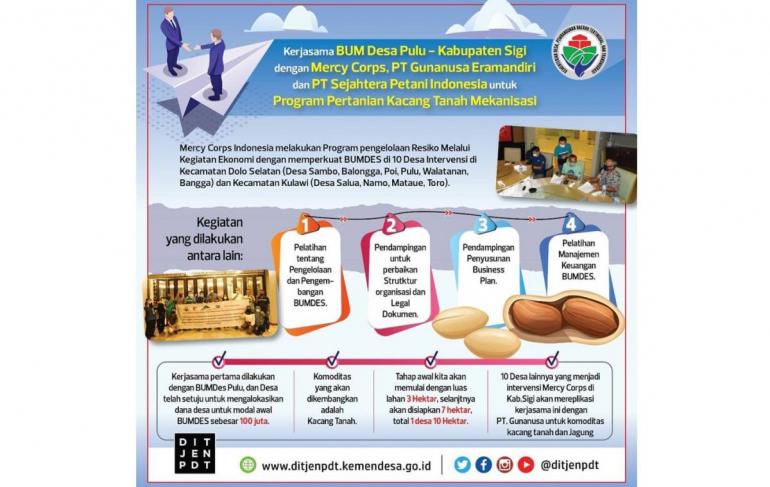 Kerjasama BUMDes Desa Pulu Kabupaten Sigi dengan PT. Gunanusa Eramandiri dan PT. Sejahtera Petani Indonesia untuk program Pertanian Kacang Tanah Mekanisasi. Kerjasama ini merupakan inisiasi dari Program Mengelola Risiko melalui Pembangunan Ekonomi (MRED) Mercy Corps Indonesia.