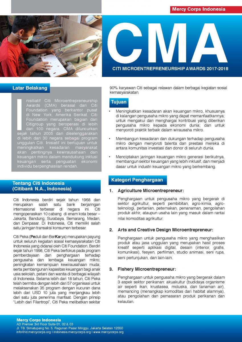 Meningkatkan Pemberdayaan Ekonomi CMA INDONESIA One Pager Bahasa Dokumen : Indonesia 18 December 2019 / Comments Dikirim oleh darisandi pada 18 December 2019 File Download (Right click - Save link as.. for direct download) ONEPAGER CMA INDONESIA 2017_12092017 2 Bahasa.pdf (867.24 KB)