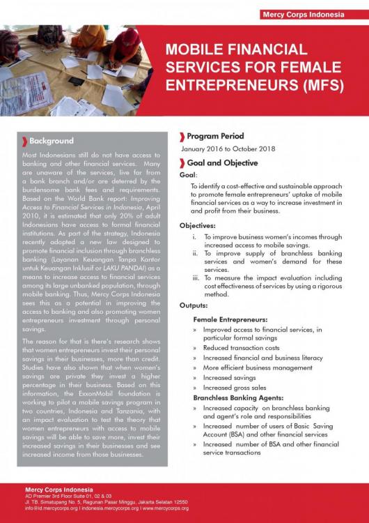 Mobile Financial Services for Female Entrepreneurs Program (MFS) atau Program Pengembangan Kaum Wanita Melalui Layanan Branchless Banking merupakan program untuk mendukung kebijakan pemerintah terkait dengan keuangan inklusif, melalui edukasi keuangan dalam rangka peningkatan kemampuan mengelola keuangan bagi perempuan pengusaha. Selain itu program juga akan mendorong munculnya agen-agen layanan bank tanpa kantor sekaligus memberikan pendidikan pada mereka. Mercy Corps Indonesia melalui program MFS akan memberikan pelatihan dan pendampingan pengelolaan keuangan usaha kepada para perempuan pengusaha dan mendorong munculnya agen layanan bank tanpa kantor di 3 kabupaten di Jawa Timur yakni Ngawi, Bojonegoro, dan Tuban.