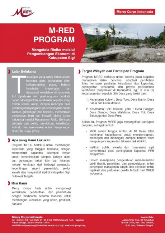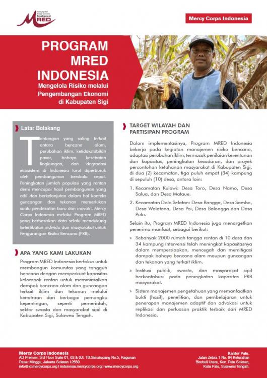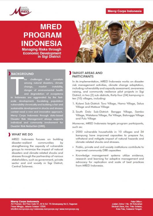 Berlandaskan hal tersebut, Mercy Corps Indonesia melalui Program MRED berfokus untuk membangun komunitas yang tangguh bencana, dengan memperkuat kapasitas kelompok rentan untuk meminimalkan dampak bahaya alam dan guncangan terkait iklim dan tekanan. Untuk mencapai hal tersebut, Program MRED berjalan dengan melibatkan berbagai pihak, yaitu pemerintah, kelompok masyarakat sipil, dan pelaku sektor swasta untuk memfasilitasi diskusi dan memanfaatkan sumber daya teknis dan keuangan yang diperlukan untuk aktivitas Pengurangan Risiko Bencana (PRB) dan pengembangan sistem pasar. Hal tersebut tidak hanya akan memperkuat implementasi program, tetapi juga akan membangun modal sosial dengan mendukung dan membantu masyarakat rentan dan sektor pemerintah dan/atau swasta yang akan memungkinkan keberlanjutan intervensi program di luar periode program.