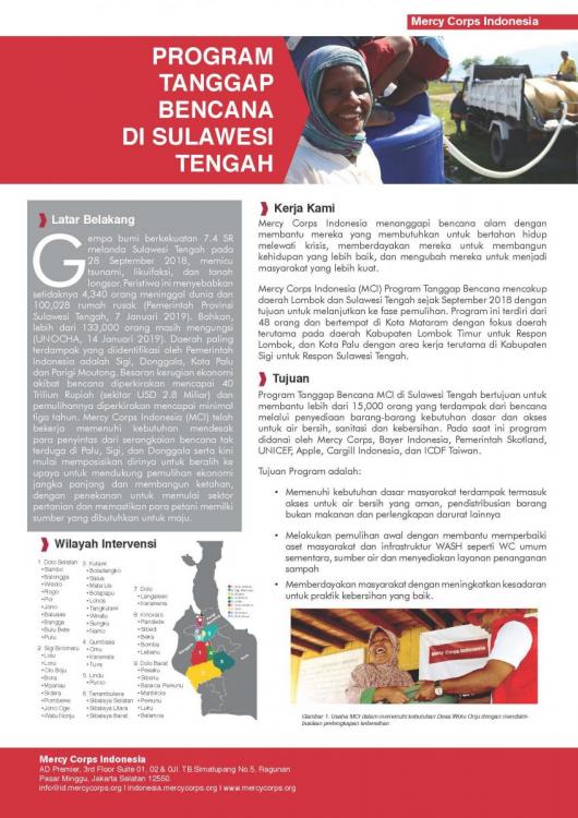 Gempa bumi berkekuatan 7.4 SR melanda Sulawesi Tengah pada 28 September 2018, memicu tsunami, likuifaksi, dan tanah longsor. Peristiwa ini menyebabkan setidaknya 4,340 orang meninggal dunia dan 100,028 rumah rusak (Pemerintah Provinsi Sulawesi Tengah, 7 Januari 2019). Bahkan, lebih dari 133,000 orang masih mengungsi (UNOCHA, 14 Januari 2019). Daerah paling terdampak yang diidentifikasi oleh Pemerintah Indonesia adalah Sigi, Donggala, Kota Palu dan Parigi Moutong. Besaran kerugian ekonomi akibat bencana diperkirakan mencapai 40 Triliun Rupiah (sekitar USD 2.8 Miliar) dan pemulihannya diperkirakan mencapai minimal tiga tahun. Mercy Corps Indonesia (MCI) telah bekerja memenuhi kebutuhan mendesak para penyintas dari serangkaian bencana tak terduga di Palu, Sigi, dan Donggala serta kini mulai memposisikan dirinya untuk beralih ke upaya untuk mendukung pemulihan ekonomi jangka panjang dan membangun ketahan, dengan penekanan untuk memulai sektor pertanian dan memastikan para petani memilki sumber yang dibutuhkan untuk maju.