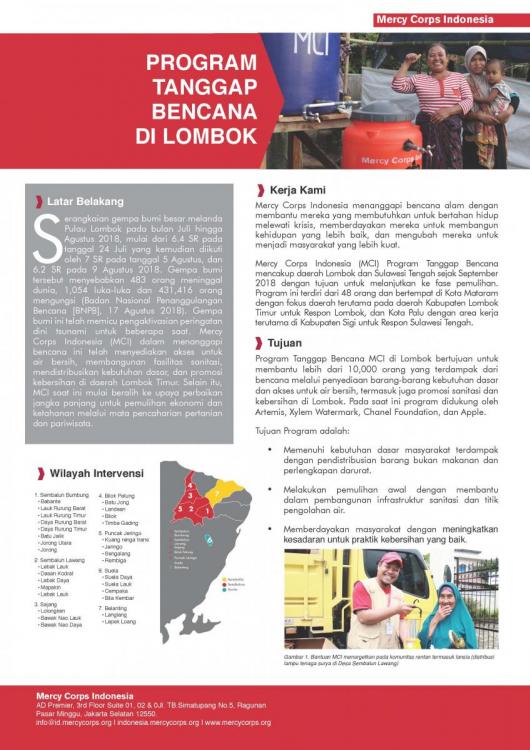 Serangkaian gempa bumi besar melanda Pulau Lombok pada bulan Juli hingga Agustus 2018, mulai dari 6.4 SR pada tanggal 24 Juli yang kemudian diikuti oleh 7 SR pada tanggal 5 Agustus, dan 6.2 SR pada 9 Agustus 2018. Gempa bumi tersebut menyebabkan 483 orang meninggal dunia, 1,054 luka-luka dan 431,416 orang mengungsi (Badan Nasional Penanggulangan Bencana [BNPB], 17 Agustus 2018). Gempa bumi ini telah memicu pengaktivasian peringatan dini tsunami untuk beberapa saat. Mercy Corps Indonesia (MCI) dalam menanggapi bencana ini telah menyediakan akses untuk air bersih, membangunan fasilitas sanitasi, mendistribusikan kebutuhan dasar, dan promosi kebersihan di daerah Lombok Timur. Selain itu, MCI saat ini mulai beralih ke upaya perbaikan jangka panjang untuk pemulihan ekonomi dan ketahanan melalui mata pencaharian pertanian dan pariwisata.