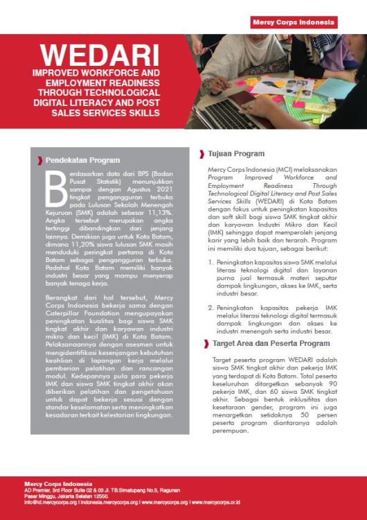 Mercy Corps Indonesia (MCI) melaksanakan Program Improved Workforce and Employment Readiness Through Technological Digital Literacy and Post Sales Services Skills (WEDARI) di Kota Batam dengan fokus untuk peningkatan kapasitas dan soft skill bagi siswa SMK tingkat akhir dan karyawan Industri Mikro dan Kecil (IMK) sehingga dapat memperoleh jenjang karir yang lebih baik dan terarah. Program ini memiliki dua tujuan, sebagai berikut: